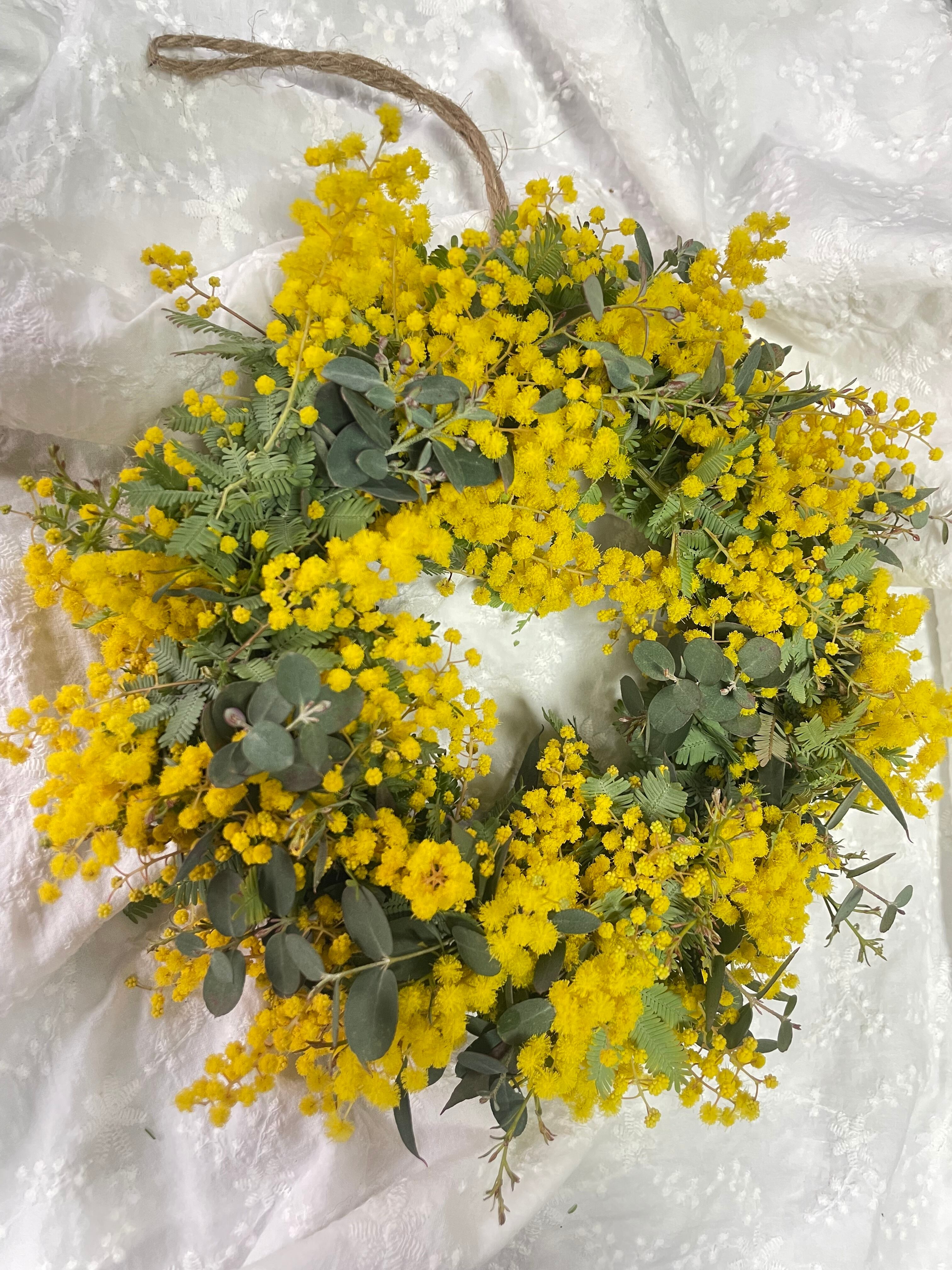 このミモザハーフリースは、直径23センチの手作りで、ナチュラルなデザインが魅力です。明るい色合いのミモザが、お部屋をほんのりと華やかに演出し、癒しの空間を作り出します。
